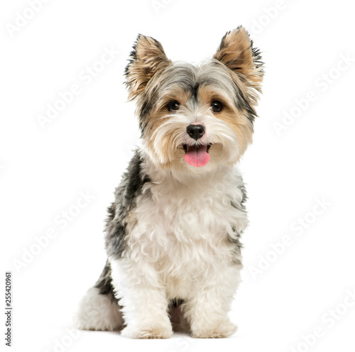 Biewer Yorkshire Terrier 3 Years Old Sitting In Front Of White